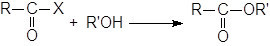 Реакция ацилгалогенидов со спиртами – наилучший общий метод получения сложных эфиров. Реакция находит широкое применение и может быть проведена для субстратов, содержащих различные функциональные группы. Для связывания образующегося НХ часто добавляют основания. В методе Шоттена-Баумана используется водный раствор щелочи, но часто применяется пиридин. Как R, так и R’ могут быть первичными, вторичными или третичными алкилами или арилами. В сложных случаях, особенно для стерически затрудненных кислот или третичных R’, вместо спирта можно брать алкоголят ион.