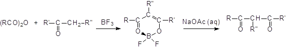 Продуктом является комплекс, содержащий BF2, который под действием водного ацетата натрия разлагается с образованием ацилированного кетона. Следовательно, трифторид бора и кетон надо брать в эквимолярных соотношениях. Реакции ацилирования сложных эфиров сложными эфирами. Конденсации Кляйзена и Дикмана.