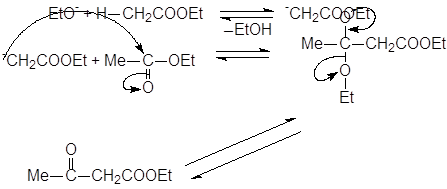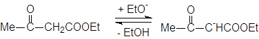 При обработке сложных эфиров, содержащих атом водорода в a-положении, сильным основанием (этилат натрия), происходит конденсация, приводящая к b-кетоэфирам. Эта реакция называется конденсацией Кляйзена: