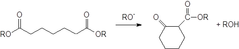 Если две сложноэфирные группы, участвующие в конденсации, находятся в одной молекуле, в результате получается циклический b-кетоэфир; такая реакция называется конденсацией Дикмана: Наилучшие результаты при конденсации Дикмана получены для синтеза пяти-, шести- и семичленных циклов. Реакции, приводящие к циклам с числом атомов в кольце от 9 до 12, идут с очень низким выходом или не идут совсем; циклы большего размера синтезированы с использованием метода высокого разбавления. Реакция ацилирования Фриделя-Крафтса.Данная реакция позволяет присоединять к бензолу ацильный радикал. В присутствии кислот Льюиса хлорангидриды и ангидриды кислот дают ион ацилия R–C+=O, который действует как эффективный электрофильный реагент, приводя к образованию кетона: