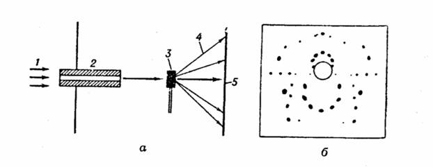 Рис. 4. а – Схема метода рентгеновской съёмки по Лауэ: 1- пучок рентгеновских лучей, падающих на монокристаллический образец; 2 – коллиматор; 3 – образец; 4 – дифрагированные лучи; 5 – плоская фотоплёнка; б – типичная лауэграмма. Важное свойство лауэграммы состоит в том, что при соответствующей ориентировке кристалла симметрия расположения этих кривых отражает симметрию кристалла. По характеру пятен на лауэграммах можно выявить внутренние напряжения и некоторые другие дефекты кристаллической структуры. Индицирование же отдельных пятен лауэграммы весьма затруднительно. Поэтому метод Лауэ применяют исключительно для нахождения нужной ориентировки кристалла и определения его элементов симметрии. Этим методом проверяют качество моно кристаллов при выборе образца для более полного структурного исследования. В методе порошка (рис 5.а), так же как и во всех остальных описываемых ниже методах рентгеновской съёмки, используется монохроматическое излучение. Переменным параметром является угол q падения так как в поликристаллическом порошковом образце всегда присутствуют кристаллики любой ориентации по отношению к направлению первичного пучка.
