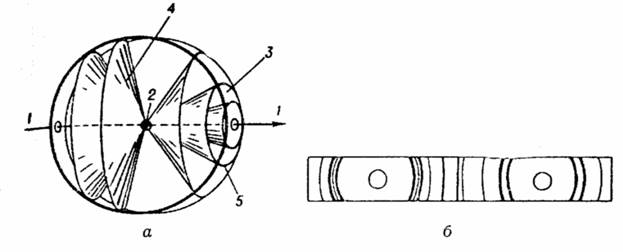 Рис 5.а – схема рентгеновской съёмки по методу порошка: 1 – первичный пучок; 2 – порошковый или поликристаллический образец; 3 – фотоплёнка, свёрнутая по окружности; 4 – дифракционные конусы; 5 – «дуги» на фотоплёнке, возникающие при пересечении её поверхности с дифракционными конусами; б – типичная порошковая рентгенограмма (дибаеграмма). Лучи от всех кристалликов, у которых плоскости с данным межплоскостным расстоянием dhk1 находятся в «отражающем положении», то есть удовлетворяют условию Вульфа – Брэгга, образуют вокруг первичного луча конус с углом растра 4q. Каждому dhk1 соответствует свой дифракционный конус. Пересечение каждого конуса дифрагированных рентгеновских лучей с полоской фотоплёнки, свёрнутой в виде цилиндра, ось которого проходит через образец, приводит к появлению на ней следов, имеющих вид дужек, расположенных симметрично относительно первичного пучка (рис. 5.б). Зная расстояния между симметричными «дугами», можно вычислить соответствующие им межплоскостные расстояния d в кристалле. Метод порошка наиболее прост и удобен с точки зрения техники экспермента, однако единственная поставляемая им информация – выбор межплоскостных расстояний – позволяе расшифровывать самы простые структуры. В методе вращения (рис. 6.а) переменным параметром является угол q. Съёмка производится на цилиндрическую фотоплёнку. В течение всего времени экспозиции кристалл равномерно вращается вокруг свей оси, совпадающей с каким-либо важным кристаллографическим направлением и с осью образуемого планкой цилиндра. Дифракционные лучи идут по образующим конусов, которые при пересечении с плёнкой дают линии, состоящие из пятен (так называемые слоевые линии (рис. 6.б). Метод вращения даёт экспериментатору более богатую информацию, чем метод порошка. По расстояниям между слоевыми линиями можно рассчитать период решётки в направлении оси вращения кристалла.