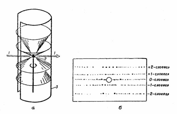 Рис. 6.а – схема рентгеновской съёмки по методу вращения: 1 – первичный пучок; 2 – образец (вращается по стрелке); 3 – фотоплёнка цилиндрической формы; б – типичная рентгенограмма вращения. В рассматриваемом методе упрощается индицирование пятен рентгенограммы. Так если кристалл вращается вокруг оси с решётки, то все пятна на линии, проходящей через след первичного луча, имеют индексы (h,k,0), на соседних с ней слоевых линиях – соответственно (h,k,1) и (h,k,1¯) и так далее. Однако и метод вращения не даёт всей возможной информации, так никогда неизвестно, при каком угле поворота кристалла вокруг оси вращения образовалось то или иное дифракционное пятно. В методе качания, который является разновидностью метода вращения, образец не совершает полного вращения, а «качается» вокруг той же оси в небольшом угловом интервале. Это облегчает индицирование пятен, так как позволяет как бы получать рентгенограмму вращения по частям и определять с точностью до величины интервала качания, под каким углом поворота кристалла к первичному пучку возникли те или иные дифракционные пятна. Наиболее богатую информацию дают методы рентгеногониометра. Рентгеновский гониометр, прибор, с помощью которого можно одновременно регистрировать направление дифрагированных на исследуемом образце рентгеновских лучей и положение образца в момент возникновения дифракции. Один из них – метод Вайссенберга, является дальнейшим развитием метода вращения. В отличие от последнего, в рентгеногониометре Вайссенберга (рис. 7) все дифракционные конусы, кроме одного, закрываются цилиндрической ширмой, а пятна оставшегося дифракционного конуса (или, что то же, слоевой линии) «разворачиваются» на всю площадь фотоплёнки путём её возвратно-поступательного осевого перемещения синхронно с вращением кристалла. Это позволяет определить, при какой ориентации кристалла возникло каждое пятно вассенбергограммы.