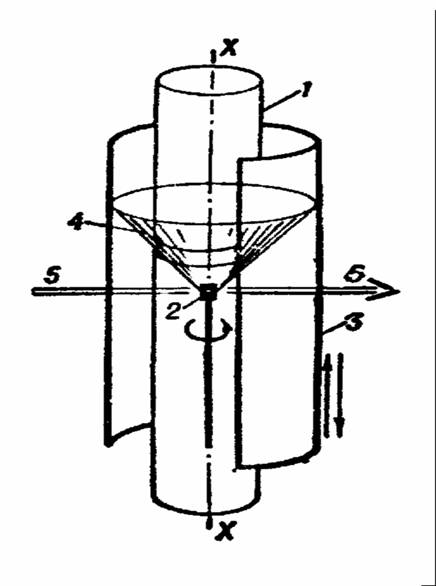 Рис. 7. Принципиальная схема рентгенгониометра Вайссенберга: 1 – неподвижная ширма, пропускающая только один дифракционный конус; 2 – кристалл, поворачивающийся вокруг оси Х – Х; 3 – цилиндрическая фотоплёнка, двигающаяся поступательно вдоль оси Х – Х синхронно с вращением кристалла 2; 4 – дифракционный конус, пропущенный ширмой; 5 – первичный пучок. Существуют и другие методы съёмки, в которых применяется одновременное синхронное движение образца и фотоплёнки. Важнейшими из них являются метод фотографирования обратной решётки и прецессионный метод Бюргера. Во всех этих методах использована фотографическая регистрация дифракционной картины. В рентгеновском дифрактометре можно непосредственно измерять интенсивность дифракционных отражений с помощью пропорциональных, сцинтилляционных и других счётчиков рентгеновских квантов. Применение рентгеноструктурного анализа. Рентгеноструктурный анализ позволяет объективно устанавливать структуру кристаллических веществ, в том числе таких сложных, как витамины, антибиотики, координационные соединения и т.д. Полное структурное исследование кристалла часто позволяет решить и чисто химические задачи, например установление или уточнение химической формулы, типа связи, молекулярного веса при известной плотности или плотности при известном молекулярном весе, симметрии и конфигурации молекул и молекулярных ионов. Рентгеноструктурный анализ с успехом применяется для изучения кристаллического состояния полимеров. Ценные сведения даёт рентгеноструктурный анализ и при исследовании аморфных и жидких тел. Рентгенограммы таких тел содержат несколько размытых дифракционных колец, интенсивность которых быстро падает с увеличением q. По ширине, форме и интенсивности этих колец можно делать заключения об особенностях ближнего порядка в той или иной конкретной жидкой или аморфной структуре. Важной областью применения рентгеновских лучей является рентгенография металлов и сплавов, которая превратилась в отдельную отрасль науки. Понятие «рентгенография» включает в себя, наряду с полным или частичным рентгеноструктурным анализом, также и другие способы использования рентгеновских лучей – рентгеновскую дефектоскопию (просвечивание), рентгеноспектральный анализ, рентгеновскую микроскопию и другое. Определены структуры чистых металлов и многих сплавов. основанная на рентгеноструктурном анализе кристаллохимия сплавов – один из ведущих разделов металловедения. Ни одна диаграмма состояния металлических сплавов не может считаться надёжно установленной, если данные сплавы не исследованы методами рентгеноструктурного анализа. Благодаря применению методов рентгеноструктурного анализа оказалось возможным глубоко изучить структурные изменения, протекающие в металлах и сплавах при их пластической и термической обработке. Методу рентгеноструктурного анализа свойственны и серьёзные ограничения. Для проведения полного рентгеноструктурного анализа необходимо, чтобы вещество хорошо кристаллизовалось и давало достаточно устойчивые кристаллы. Иногда необходимо проводить исследование при высоких или низких температурах. Это сильно затрудняет проведение эксперимента. Полное исследование очень трудоёмко, длительно и сопряжено с большим объёмом вычислительной работ