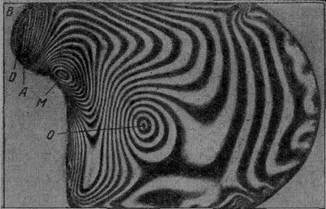 Рис.1 Картина полос в диске, выдавленном в зазор: А и В – точки максимальных растягивающих напряжений на свободном контуре; О – нулевые точки; М – точки максимального касательного напряжения.