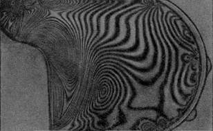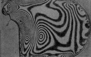 Рис.4. Картина изохром в секторной модели амортизатора шифра 1-1(секторный): О – нулевые точки Исследовались модели серийных амортизаторов шифра 1-1 (рис. 4). В этом случае радиус амортизатора немного более размеров сечения и задачу нельзя решать, как задачу о плоскодеформированном напряженном состоянии. Поэтому двумя радиальными сечениями вырезали сектор или элемент переменной толщины. Картина полос в этом элементе получена в монохроматическом свете. Цена полосы является функцией толщины (рис. 5) и определяется по формуле Ksho = K . so1,0 / h K = tдет./ tмод. = P/2prltмод. где Р—сила, действующая на амортизатор; l—ширина детали в данном сечении; tдет и tмод — средние касательные напряжения в том же сечении модели и детали. Напряжения на свободном контуре (рис. 6) модели определяли по формуле s1 = 6 Ksho m Стендовые испытания амортизаторов шифра 1—1 показали, что и в этом случае трещины появляются на контуре в областях наибольших растяжений.