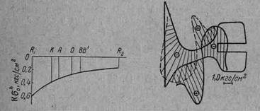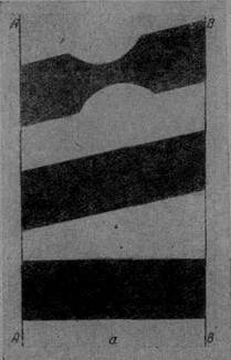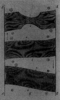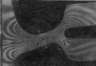Рис. 2. Разрушение диска, выдавленного в зазор: а - разрушение в точке А; б – разрушение в точке В. Пластинчатый амортизатор, работающий на сдвиг. Казалось, что можно так расположить сечение амортизатора, чтобы длина свободного контура уменьшалась, т. е. на контуре не было растягивающих напряжений. Для проверки к двум параллельным жестким планкам АА и ВВ приклеивали три резиновые пластины (рис. 3,а), оси которых различно ориентированы по отношению к осям планок. При перемещении планки ВВ в плоскости пластин, параллельно планке АА, во всех трех пластинах возникает напряженное состояние. Просвечивание этих моделей в поляризованном свете показало, что на свободном контуре образуются как сжатые так и растянутые участки (рис. 3, б) (получить только сжатый контур невозможно). Точки О—нулевые; слева и справа от них возникают соответственно растягивающие Å и сжимающие Q напряжения.