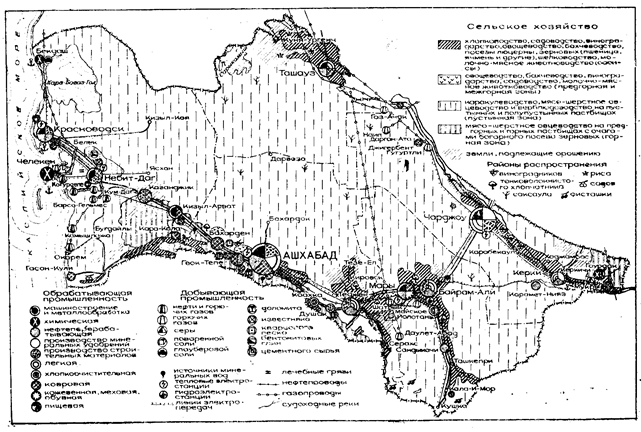Химический комплекс Туркменистана объединяет добычу химических продуктов и представлен предприятиями горно-химической, основной химии и нефтехимической промышленности республики. Горно-химическая промышленность развивается на базе местных химических ресурсов: минеральных солей, самородной серы, йода, брома. Основные предприятия — Гаурдакский серный завод, Челекенский химический завод, Небит-Дагский йодный завод, производственное объединение Карабогазсул-ь-фат. Продукцию основной химии производят Чарджоуский химический завод и завод азотных удобрений в Мары. Чарджоуский химический завод выпускает также серную кислоту, сер-но-кислый алюминий и полиэтиленовую пленку. Все большее значение приобретает промышленность бытовой химии. Нефтехимическая промышленность представлена Красно-водским нефтеперерабатывающим заводом, Чарджоуским нефтехимическим комбинатом (в перспективе), Челекенским заводом технического углерода, Небит-Дагским йодным заводом. Машиностроение и металлообработка. В общем объеме промышленной продукции удельный вес машиностроения и металлообработки составляет 4%. В стране работают 53 машиностроительных и металлообрабатывающих предприятия, которые производят вентиляторы для градирен, нефтеаппаратуру, нефтяные центробежные насосы, установки механизированного слива нефтепродуктов из железнодорожных цистерн, технологическое оборудование для предприятий торговли и общепита, бороны, прицепные культиваторы, газовые плиты, светотехнические изделия, кабельную продукцию, металлические кровати, металлические емкости. Многочисленные предприятия осуществляют ремонт машин и оборудования. Отраслевая структура машиностроения республики такова: нефтяное машиностроение, электротехническая промышленность, машиностроение для пищевой промышленности, коммунально-бытовое машиностроение, производство металлических изделий, ремонт машин и оборудования, прочие отрасли машиностроения и металлооборудования. Другое предприятие нефтяного машиностроения — Марыйский машиностроительный завод, выпускает мощные центробежные нефтяные насосы для перекачки нефти, которые вывозятся в различные районы СНГ и экспортируются более чем в 20 стран мира. Электротехническая отрасль республики представлена Ашхабадским заводом светотехнического оборудования. Ашхабадский завод (введен в эксплуатацию в 1960 г.) изготовляет тестомесильные и кремовзбивальные машины для предприятий торговли и общественного питания. Продукция завода поступает на кондитерские предприятия страны, а также экспортируется в страны СЭВ, Афганистан, Иран и другие страны. Коммунально-бытовое машиностроение представлено Ашхабадским заводом газовой аппаратуры «Красный молот», (создан в 1934 г.) одним из ведущих в Средней Азии по выпуску бытовых газовых плит (двух- и четырехконфорные). В республике имеется ряд предприятий по производству металлических изделий производственного и непроизводственного назначения — металлической тары (емкости для нефтехранилищ), железных и чугунных решеток, ручного сельскохозяйственного и садово-огородного инструмента, металлические кроватей, термосов, строительных металлоизделий. ••'"*В Туркменской ССР создана мощная база по ремонту автомобилей, тракторов, тепловозов, железнодорожных вагонов, морских и 