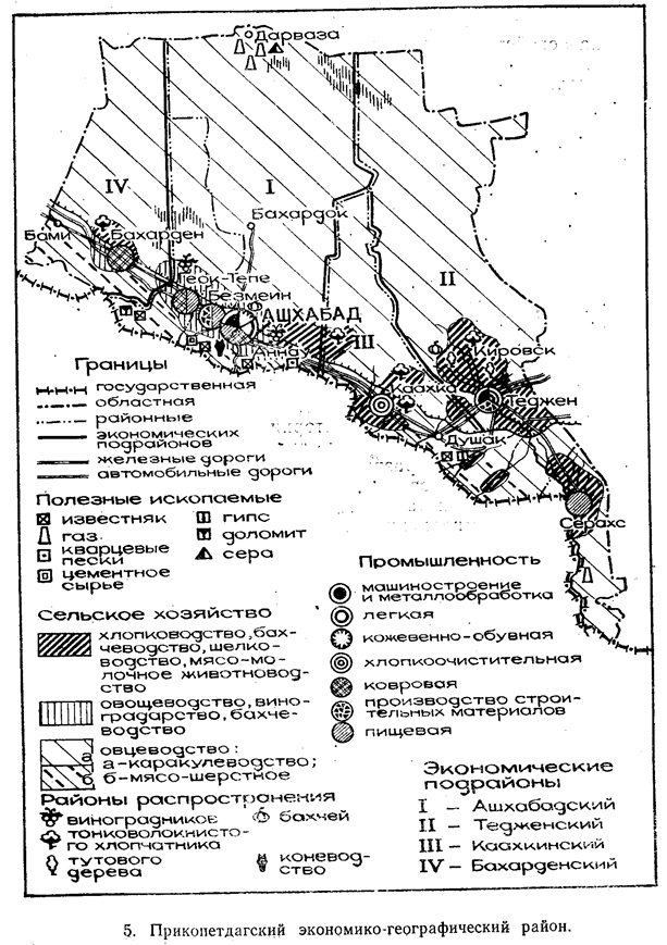 Средняя плотность населения 12,2 чел. на 1 км2. Большая часть территории области занята пустыней Каракумы и горами Копетдаг, которые редко заселены. В оазисах плотность населения достигает в среднем 80—90 чел. на 1 км2, а в наиболее густонаселенном Ашхабад — Геок-Тепинском районе — до 100 чел. Общая численность населения Прикопетдагского экономического района в 1926—1983 гг. увеличилась более чем в 3,5 раза, а городское население — в 8 раз, и его доля в общей численности населения повысилась с 26% в 1926 г. до 65% в 1983 г. Необходимо отметить, что рост городского населения района прежде всего связан с нахождением здесь столицы республики Ашхабада, где сосредоточено 72% всего городского населения района. Большинство населенных пунктов размещено вдоль Каракумского канала, железной и автомобильных дорог, которые стали хозяйственной осью экономического района., Прикопетдагский район относится к числу немногих районов страны, в которых абсолютная численность сельского населения не сокращается, а наоборот увеличивается. Это вызвано развитием сельского хозяйства и быстрым темпом естественного прироста населения в сельскйх окрестностях. Для района свойственны высокие темпы естественного прироста населения. Население Прикопетдагского района многонационально. По данным переписи населения 1997 г. в области проживают туркмены, русские, казахи, татары, украинцы, узбеки, армяне, азербайджанцы и др. Особенно отличаются многонациональностью города и поселки городского типа. Однородны по национальному составу сельские районы, здесь преобладают туркмены, русские, казахи. В Прикопетдагском районе насчитывается 3 города, 3 городских, 8 сельских районов, 13 поселков городского типа, 52 сельских Совета (на 1 января 1984 г.). В районе производится более '/5 промышленной продукции республики, занято более 40% промышленно-произаодственного персонала Туркменской ССР. Прикопетдагский район имеет чрезвычайно разнообразные природные и экономические условия для производства. Выявление и их учет — необходимое условие при планировании развития и размещения производительных сил района. Неравномерно размещены по территории района промышленные, сельскохозяйственные объекты, дороги, населенные пункты. Неодинаков и уровень развития отраслей социальной инфраструктуры. Районные различия, особенности развития производства в разных частях района могут быть раскрыты лишь путем обоснований формирования территориальных социально-экономических единиц и их типологии. Территориальные социально-экономические микрокомплексы Прикопетдагского района формируются под воздействием многочисленных комплексообразу-ющих факторов. В Прикопетдагском районе выделяются 4 экономических подрайона: Ашхабадский, Тедженский, Бахарденский, Каах-кинский. Ашхабадский подрайон занимает ведущее место во всей территориальной системе производительных сил уровня развития. Подрайон включает г. Ашхабад, Безмеин, Геок-Тепинский, Ашхабадский, Гяурский административные районы. Здесь сформированы крупные промышленные центры области и республики — Ашхабад и Безмеин. Территория комплекса составляет 33% всей территории, а население — 64% всего населения Прикопетдагского района. Значительна роль микрокомплекса в производстве сельскохозяйственных- продуктов. По степени особенности и развития про