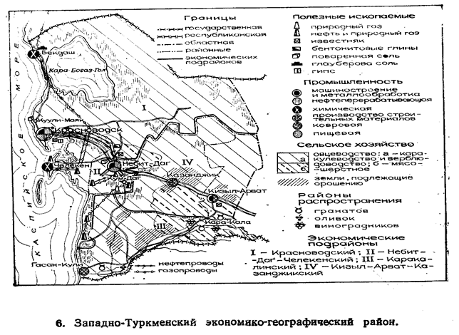 ЗАПАДНО-ТУРКМЕНСКИЙ ЭКОНОМИЧЕСКИЙ РАЙОН Западно-Туркменский экономический район расположен на территории Красноводского административного района. Площадь равна 138,5 тыс. км2 (28,4%) общей площади Туркменистана, где проживает 5321 тыс. человек (на 1.01.81 г.), или 11,2% населения республики. Западный Туркменистан — основной район республики, где добывают нефть, газ, различные соли, строительные материалы, йод, бром, бентонит; осуществляют рыбный промысел (Каспийское море). Западный Туркменистан самый вододефицитный район республики; поверхностные водные источники очень немногочисленны, а воды Каспия не пригодны для питья и орошения; осадки крайне незначительны, что делает район самым засушливым в республике. Минерально-сырьевые ресурсы сосредоточены и разрабатываются только в западной зоне (между железной дорогой и Каспием), которая занимает 1/10 часть территории района. Западный Туркменистан наиболее урбанизированный район республики. Удельный вес городского населения составляет 82% (по стране — 48%), что в 1,8 раза выше, чем в среднем по республике. Здесь сравнительно низкий естественный прирост населения. Если в 1998 г. по республике на 1000 человек населения естественный прирост составлял 26,7 человек, то в Западном Туркменистане этот показатель равен 21,7 человек. Плотность населения самая низкая — 2,4 человека на 1 км2 (по республике — 6,2 чел. на 1 км2). Району присущи все черты, характерные для промышленных концентраций, сформировавшихся на базе нефтедобычи (доля нефтяной промышленности составляет более 75%). В районе совершенно не развито орошаемое земледелие, что объясняется ограниченностью водных ресурсов. Площадь орошаемых земель составляет только 1,1% от общереспубликанской. Сельское хозяйство имеет пастритпнп-живптнпволчаскую специализацию, главным образом, овцеводство и верблюдоводство. Западно-Туркменский экономико-географический район. В пределах Западного Туркменистана находится единственный в республике субтропический район, который в перспективе должен превратиться в один из крупнейших районов по _ппоизводству субтропических продуктов. Поселки городского типа района (17) имеют одну или две специализированные отрасли промышленности, которые ощущают дефицит рабочих кадров, особенно женских. Основные специализируюшиеся отрасли Западно-Туркмейского экономического района: нефтедобывающая н нефтеперерабатываюшая, химическая, газодобывающая, производство электроэнергии, рыбное, субтропическое хозяйство, овцеводство, верблюдоводство. В районе функционируют нефте-гаэеэнергетический, морехозяйственный, пастбище-животноводческий, индустриальный, субтропическйи, аграрно-промышлейный, энергопроизводственные циклы (ЭПЦ). Нефтяная промышленность функционирует на основе производственных связей «по вертикали», то есть от сырья до готовой продукции, и включает следующие взаимозаменяемые производственно-технологические стадии: поиск и разведка нефтегазовых месторождений — строительство нефтяных и газовых эксплуатационных скважин — добыча нефти и газа — транспортировка нефти к нефтеперерабатывающим заводам —.хранение нефти в резервуарах — подача нефти на нефтеперерабатывающий завод — производство нефтепродуктов. Входящая в структуру цикла энергетическая промышленность (производство электрической энергии и теп