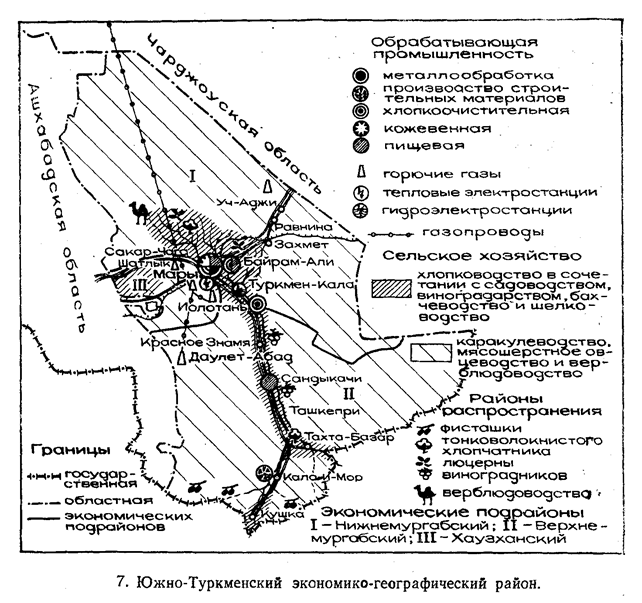 Южно-Туркменский экономический район — крупный территориально-экономический комплекс Туркменистана. Площадь района 86,7 тыс. км2 (17,9% всей территории страны). На территории проживает 1238,3 тыс. человек (на 1.07.97 г.), или 19,6% населения республики; в г. Мары, областном центре — 77 тыс. человек. В состав района входят 10 административных районов, 4 города, 16 поселков городского типа, 65 сельских Советов. Район отличается быстрым ростом промышленности: здесь производится 23,2% промышленной продукции республики, занято 11,3% промышленно-производственного персонала и сосредоточено 17,6% промышленных предприятий. Ведущие отрасли промышленности — энергетическая и газовая, которые имеют общесоюзное значение. На долю Южно-Туркменского социально-экономического района приходится около 4% общесоюзного и более 70% республиканского производства электрической энергии, 8% добываемого газа в СССР и половина республиканской добычи. В Мары находится единственное предприятие республики, выпускающее центробежные насосы для нефтяной и газовой промышленности. Здесь же расположен кожевенный завод, производящий различные хромовые кожи для обувной промышленности республики. Заводы и фабрики района производят растительное масло, мытую шерсть, хлопок-волокно, мыло, пиво, виноматериалы, текстильные изделия. Развитие капитального строительства вызвало рост производства строительных материалов. Южно-Туркменский экономический район — крупный аг-рарно-промышленный комплекс республики: 31 совхоз и 90 колхозов производят сельскохозяйственные продукты. -.Посевные площади района составляют 305 тыс, га (35,7% общереспубликанского посева), на его долю приходится 36% производства хлопка-сырца Туркменской ССР. ^-Развитие отраслей материального производства и сферы обслуживания населения как республики, так и Марыйского комплекса, обеспечивает система железнодорожных, автомобильных дорог, система трубопроводного транспорта, речной транспорт Каракумского канала и воздушный транспорт. В районе развита социальная инфраструктура. Такие отрасли, как торговля и общественное питание, жилищное, коммунальное хозяйства, бытовое обслуживание населения, здравоохранение, народное образование и другие способствуют непрерывному повышению жизненного уровня населения рассматриваемого района. В современных условиях в высокой степени узкоотраслевой специализации и кооперации происходит процесс интеграции различных отраслей народного хозяйства и образования межотраслевых производственных и социально-экономических комплексов. В Южно-Туркменском экономическом районе сформированы следующие межотраслевые комплексы: газоэнергохимический межотраслевой, совокупность аграрно-промышленных комплексов (воднохозяйственный, хлопковый аграрно-промышлснный, продовольственный аграрно-промышленный), индустриально-строительный и комплекс социальной инфраструктуры. Химическая отрасль представлена Туркменским азотно-ту-ковым комбинатом в Мары, сырьем для которого является природный газ Шатлыка. В совокупности агропромышленных комплексов выделяются три группы отраслей: отрасли, занятые производством и поставкой сельскому хозяйству средств производства и его производственно-техническим обслуживанием; собственное сельскохозяйственное производство; отрасли по заготовке, пере