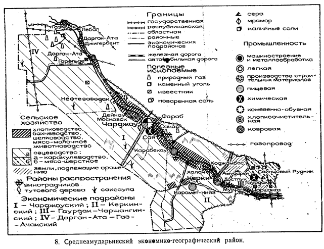 Район расположен на востоке республики на территории Чарджоуской области. Площадь 93,8 тыс. км2 (19,4% территории страны), численность населения 1134,1 тыс. человек (1.1.1997 г.). Это — 21% от общей численности республики. В состав района входят 2 города (Чарджоу, Керки), 21 поселок городского типа. Важной особенностью экономико-географического положения района является большая протяженность его по долине среднего течения Амударьи, которая образует хозяйственно-экономическую ось района. По характеру рельефа основная часть территории Средпеамударьинского экономического района (более 90%) представляет собой равнину, занятую пустынями и оазисами. Экономический район находится по обоим берегам среднего течения р. Амударьи. Левобережье занято пустыней Каракумы, к которой на крайнем юге-западе примыкают северные окраины возвышенности Карабиль, на северо-западе правобережья — окраина пустыни Кызылкум, в центре — пески Сундукли. . В пределах экономического района имеются различные виды полезных ископаемых: самородная сера (Гаурдак), природный газ, калийные, каменные, поваренные соли, карлюкскпе минеральные стройматериалы и небольшие запасы угля, 11 крупных газовых месторождений — Ачак, Наип, Саман-Тепе, Багаджа, Гугуртли, Сакар, Фараб, Беури — Дешик — Сев, Балкуи, Ме-теджан. Основной водной артерией экономического района является Амударья — крупнейшая река в Средней Азии. Значение Аму-дарьи для экономического и социального развития Чарджоус-кой области огромно. Она является источником орошения, водной транспортной магистралью, сырьем для промышленности, питьевой водой для населения, имеет ресурсы ихтиофауны. В Чарджоуском экономическом районе уделяется большое внимание охране окружающей среды. В Каракумах в 70 км от Чарджоу на ст. Репетек по инициативе Русского географического общества основана Репетекская песчано-пустынная станция. Национальный состав населения Среднеамударьинского социально-экономического района по данным переписи 17 января 1979 г. представлен так: 72,2% населения составляют туркмены, 11% — узбеки, 10% — русские, 2% — татары, 1% — казахи и 3% — прочие национальности. Особенно многонационально население в городских поселениях района. Средняя плотность населения 6,5 человек на 1 км2 (на 1 января 1981 г.), а в пустынях Каракумы, Кызылкумы она составляет менее 1 чел. на 1 км2, в оазисах в долине среднего течения р. Амударьи достигает 160 чел. на 1 км2. Удельный вес городского населения — 46%, сельского 54% (на 1 января 1981 г.). Численность населения г. Чарджоу составляет 146 тыс. чел. (1.1.1981 г.). В территориальном разделении труда Чарджоуский экономический район выделяется как один из важнейших районов химической, газодобывающей, хлопкоочистительной, шелкоткацкой, каракулевой промышленности республики. На территории района создан значительный экономический потенциал с соответствующей производственной и непроизводственной инфраструктурой. На долю экономического района приходится 22,8% валовой продукции промышленности республики, в том числе третья часть добычи газа, все минеральные удобрения, около '/« хлопка-волокна, все шелковые и шерстяные ткани _и бельевой трикотаж. Здесь сосредоточено более 20% всех промышленных предприятий и промышленности района, занято 21,3% всего промышленно-производственного персонала республики. Среднеамударьинскй райо