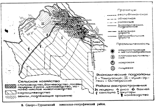 Район расположен в северной части республики. Площадь 73,6 тыс. км2. Население 536,4 тыс. чел. (на 1.01.97 г.). Делится на 8 административных районов, имеется 2 города, 7 поселков городского типа. Северо-Туркменский экономический район, расположенный на левобережье нижнего течения Амударьи, имеет равнинную поверхность. Восточную, большую часть территории занимают Заунгузские пески Каракумов (более 50% территории района), северную часть—аллювиальные равнины старых дельтовых русел Амударьи (Довдан, Дарялык, Тунударья, Акдарья). По трассе русел встречаются многочисленные подвижные пескн (Орунгум, Урпакгум, Овезалы, Атачаган, Секизатлы, Бешой, Гарапорсан, Лавак, Эшегарбат). В северо-западной, северо-восточной и центральной части района невысокие (25—40 м) третичные остаточные возвышенности Капланкыр, Дузгыр, Ганнагыр, Теримгая, Гоюнкырлан, Бичандаг, Мисгината и др. На территории района находятся самые глубокие котловины республики (Акджакая — 81 м, Сарыкамыш — 38 м), имеются минеральные строительные материалы (гранит, мрамор, известняки, мергель, гипс, строительная глина). В Северо-Туркменском экономическом районе проживают (поданным переписи 1979 г.) туркмены (61%), узбеки (30,6%), казахи (4,6%), русские (1,6%) и другие национальности (2%). Средняя плотность населения 7,4 чел. на 1 км2 (1981 г.). Городское население составляет 30%, сельское — 70% В густонаселенных районах оазиса плотность населения 110 человек и более на 1 км2, на редконаселенных пустынных территориях Каракумов — 0,1 чел. на 1 км2. В областном центре городе Ташаузе проживают более 100 тыс чел. (1984 г.). В целом Северный Туркменистан аграрно-промышленный район. Ведущее место в промышленности района занимает легкая и пищевая промышленность, связанные с переработкой сельскохозяйственного сырья, прежде всего, хлопка-сырца. На долю района приходится 9,6% валовой продукции промышленности и занято 9% промышленно-производственного персонала республики. Основные отрасли промышленности.— хлопкоочистительная, маслобойножировая, мясо-молочная, металлообрабатывающая. В структуре земельного фонда экономического района пашни занимают 2,6%, пастбища — 46%. В районе широко развита сеть ирригационных систем: Шават, Джумбай-Сака, Клыч-Бай, Ярмыш, Кыркгызой, Советяп, строится Тюямуюн —Ташаузский канал. Посевные площади занимают 202 тыс. га (1980 г.), в том числе под хлопчатником 122 тыс. га, кормовыми культурами — 52 тыс. га. (1980 г). Область дает 31% производимого хлопка-волокна в республике (1980 г В пределах рассматриваемого экономического района, можно выделить: Ташаузский промышленно-сельскохозяйственный и Куня-Ургенч сельскохозяйственный подрайоны. Каждый из подрайонов отличается своеобразием специализации хозяйств, тяготением к промышленным центрам, наличием природных и трудовых ресурсов, уровнем их использования. В Ташаузский промшиленно-сельскохозяйственный подрайон входят г. Ташауз и территории Ташаузского, Тахтинского, Ильялинского, Ленинского, Калининского и Тельманского районов. Ведущими отраслями народного хозяйства рассматриваемого подрайона являются хлопкоочистительная, масложирова,я, машиностроительная (ремонт машин, занятых в хлопководстве) промышленность, водное хозяйство, автомобильный и железнодорожный транспорт (автотранспорт осуществляет перевозки хлопка-сырца от заготпунктов до хлопкоочистительных за