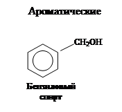 По положению гидроксильной группы спирты делятся на : первичные – с гидроксильной группой у конечного звена цепи углеродных атомов, у которого, кроме того, имеются два водородных атома (R-CH2-OH); вторичные, в которых гидроксил присоединен к углеродному атому, соединенному, кроме ОН-группы, с одним водородным атомом [R-СН(ОН)-R1], и третичные, у которых гидроксил соединен с углеродом, не содержащим водородных атомов [(R)С-ОН] (R-радикал: СН3,С2Н5 и т.д.) В зависимости от характера углеводородного радикала спирты делятся на алифатические, алициклические и ароматические. В отличие от галогенпроизводных, у ароматических спиртов гидроксильная группа не связана непосредственно с атомом углерода ароматического кольца [3].