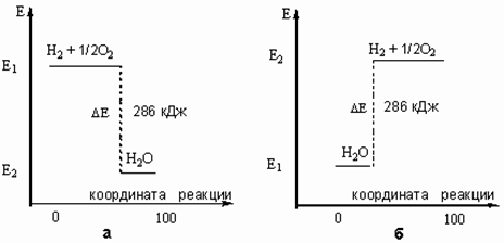 Рис. 2. Графическое изображение теплового эффекта (Q = D Е): а) экзотермической реакции горения водорода; б) эндотермической реакции разложения воды под действием электрического тока. Координату реакции (горизонтальную ось графика) можно рассматривать, например, как степень превращения веществ (100% - полное превращение исходных веществ). 1.1. Уравнения химических реакций · Уравнения химических реакций, в которых вместе с реагентами и продуктами записан и тепловой эффект реакции, называются термохимическими уравнениями. Особенность термохимических уравнений заключается в том, что при работе с ними можно переносить формулы веществ и величины тепловых эффектов из одной части уравнения в другую. С обычными уравнениями химических реакций так поступать, как правило, нельзя. Допускается также почленное сложение и вычитание термохимических уравнений. Это бывает нужно для определения тепловых эффектов реакций, которые трудно или невозможно измерить в опыте. Приведем пример. В лаборатории чрезвычайно трудно осуществить "в чистом виде" реакцию получения метана СH4 путем прямого соединения углерода с водородом: С + 2 H2 = СH4 Но можно многое узнать об этой реакции с помощью вычислений. Например, выяснить, будет эта реакция экзо- или эндотермической, и даже количественно рассчитать величину теплового эффекта. Известны тепловые эффекты реакций горения метана, углерода и водорода (эти реакции идут легко): а) СH4(г) + 2 O2(г) = СO2(г) + 2 H2О(ж) + 890 кДж б) С(тв) + O2(г) = СO2(г) + 394 кДж в) 2 H2(г) + O2(г) = 2 H2О(ж) + 572 кДж Вычтем два последних уравнения (б) и (в) из уравнения (а). Левые части уравнений будем вычитать из левой, правые - из правой. При этом сократятся все молекулы O2, СO2 и H2О. Получим: СH4(г) - С(тв) - 2 H2(г) = (890 - 394 - 572) кДж = -76 кДж Это уравнение выглядит несколько непривычно. Умножим обе части уравнения на (-1) и перенесем CH4 в правую часть с обратным знаком. Получим нужное нам уравнение образования метана из угля и водорода: С(тв) + 2 H2(г) = CH4(г) + 76 кДж/моль Итак, наши расчеты показали, что тепловой эффект образования метана из углерода и водорода составляет 76 кДж (на моль метана), причем этот процесс должен быть экзотермическим (энергия в этой реакции будет выделяться). Важно обращать внимание на то, что почленно складывать, вычитать и сокращать в термохимических уравнениях можно только вещества, находящиеся в одинаковых агрегатных состояниях, иначе мы ошибемся в определении теплового эффекта на величину теплоты перехода из одного агрегатного состояния в другое. 1.2. Основные законы термохимии · Раздел химии, занимающийся изучением превращения энергии в химических реакциях, называется термохимией. Существует два важнейших закона термохимии. Первый из них, закон Лавуазье–Лапласа, формулируется следующим образом: · Тепловой эффект прямой реакции всегда равен тепловому эффекту обратной реакции с противоположным знаком. Это означает, что при образовании любого соединения выделяется (поглощается) столько же энергии, сколько поглощается (выделяется) при его распаде на исходные вещества. Например: 2 H2(г) + O2(г) 2 H2О(ж) + 572 кДж (горение водорода в кислороде) 2 H2О(ж) + 572 кДж = 2 H2(г) + O2(г) (разложение воды электрическим током) Закон Лавуазье–Лапласа является следствием закона сохранения энергии. Второй закон термохимии был сформулирован в 1840 г российским академиком Г. И. Гессом: · Тепловой эффе
