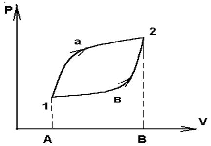 Рис. 1 Поскольку давление зависит не только от объема, но и от температуры, то при различных изменениях температуры на пути а и в при переходе одного и того же начального состояния (p1,V1) в одно и тоже конечное (p2,V2) работа получается разной. Отсюда видно , что при замкнутом процессе (цикле) 1а2в1 система совершает работу не равную нулю. На этом основана работа всех тепловых двигателей. Из первого начала термодинамики следует, что работа может совершаться или за счет изменения внутренней энергии , или за счет сообщения системе количества теплоты . В случае если процесс круговой , начальное и конечное состояние совпадают U2- U1 = 0 и W = Q , то есть работа при круговом процессе может совершаться только за счет получения системой теплоты от внешних тел . Первое начало можно сформулировать в нескольких видах : 1. Невозможно возникновение и уничтожение энергии . 2. Любая форма движения способна и должна превращаться в любую другую форму движения . 3. Внутренняя энергия является однозначной формой состояния . 4. Вечный двигатель первого рода невозможен . 5. Бесконечно малое изменение внутренней энергии является полным дифференциалом. 6. Сумма количества теплоты и работы не зависит от пути процесса. Первый закон термодинамики , постулируя закон сохранения энергии для термодинамической системы. не указывает направление происходящих в природе процессов. Направление термодинамических процессов устанавливает второе начало термодинамики. 1.4. ВТОРОЕ НАЧАЛО ТЕРМОДИНАМИКИ. Второе начало термодинамики устанавливает наличие в природе фундаментальной асимметрии , т.е. однонаправленности всех происходящих в ней самопроизвольных процессов . Второй основной постулат термодинамики связан так же с другими свойствами термодинамического равновесия как особого вида теплового движения. Опыт показывает , что если две равновесные системы А и В привести в тепловой контакт , то независимо от различия или равенства у них внешних параметров они или остаются по прежнему в состоянии термодинамического равновесия , или равновесие у них нарушается и спустя некоторое время в процессе теплообмена ( обмена энергией ) обе системы приходят в другое равновесное состояние. Кроме того , если имеются три равновесные системы А,В и С и если системы А и В поразнь находятся в равновесии с системой С, то системы А и В находятся в термодинамическом равновесии и между собой (свойства транзитивности термодинамического равновесия ). Пусть имеются две системы . Для того , чтобы убедится в том , что они находятся в состоянии термодинамического равновесия надо измерить независимо все внутренние параметры этих систем и убедиться в том , что они постоянны во времени. Эта задача черезвычайно трудная . Оказывается однако , что имеется такая физическая величина , которая позволяет сравнить термодинамические состояния двух систем и двух частей одной системы без подробного исследования и внутренних параметров. Эта величина , выражающая состояние внутреннего движения равновесной системы , имеющая одно и то же значение у всех частей сложной равновесной системы независимо от числа частиц в них и определяемое внешними параметрами и энергией называется температурой . Температура является интенсивным параметром и служит мерой интенсивности теплового движения молекул. Изложенное положение о сущ