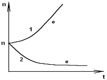 Рис. 3.4 Кривая 1: Экспоненциальный рост ; a>0 , kA>d Кривая 2: Экспоненциальная гибель ; a>0 , kA>d.