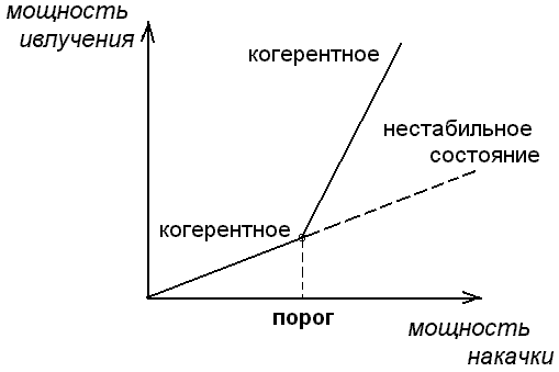При малой мощности накачки эти электромагнитные волны , которые испускает лазер , некоррелированные , и излучение подобно излучению обычной лампы. Такое некогерентное излучение - это шум , хаос. При повышении внешнего воздействия в виде накачки до порогового критического значения некогерентный шум преобразуется в ²чистый тон² , то есть испускает число синусоидальная волна - отдельные атомы ведут себя строго коррелированным образом , самоорганизуются. Лампа ® Лазер Хаос ® Порядок Шум ® Когерентное излучение В сверхкритической области режим ²обычной лампы² оказывается не стабильным , а лазерный режим стабильным , рисунок 2.9.