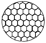 Рис. 3.1. Конвективные ячейки Бенара. Если дно сковороды плоское и нагреваем мы ее равномерно , то можно считать , что у дна и на поверхности поддерживаются постоянные температуры , снизу - Т1 , сверху - Т2 . Пока разность температуры DТ = Т1 - Т2 невелика , частички порошка неподвижны , а следовательно , неподвижна и жидкость . Будем плавно увеличивать температуру Т1 . С ростом разности температур до значения DТc наблюдается все та же картина , но когда DТ > DТc , вся среда разбивается на правильные шестигранные ячейки (см. Рис. 3.1) в центре каждой из которых жидкость движется вверх , по кроям вниз . Если взять другую сковороду , то можно убедиться , что величина возникающих ячеек практически не зависит от ее формы и размеров . Этот замечательный опыт впервые был проделан Бенаром в начале нашего века , а сами ячейки получили название ячеек Бенара . Элементарное качественное объяснения причины движения жидкости заключается в следующем . Из-за теплового расширения жидкость расслаивается , и в более нижнем слое плотность жидкости r1 меньше , чем в верхнем r2 . Возникает инверсный градиент плотности , направленный противоположно силе тяжести . Если выделить элементарный объем V , который немного смещается вверх в следствии возмущения , то в соседнем слое архимедова сила станет больше силы тяжести , так как r2 > r1 . В верхней части малый объем , смещаясь вниз , поподает в облость пониженной плотности , и архимедова сила будет меньше силы тяжести FA < FT , возникает нисходящее движение жидкости . Направление движения нисходящего и восходящего потоков в данной ячейке случайно , движение же потоков в соседних ячейках , после выбора направлений в данной ячейке детерминировано . Полный поток энтропии через границы системы отрицателен , то есть система отдает энтропию , причем в стационарном состоянии отдает столько , сколько энтропии производится внутри системы (за счет потерь на трение). dSe q q T1 - T2 ¾ = ¾ - ¾ = q * ¾¾¾ < 0 (3.1) dt T2 T1 T1 * T2 Образование именно сотовой ячеистой структуры объясняется минимальными затратами энергии в системе на создание именно такой формы пространственной структуры . При этом в центральной части ячейки жидкость движется вверх , а на ее периферии - вниз. Дальнейшее сверхкритическое нагревание жидкости приводит к разрушению пространственной структуры - возникает хаотический турбулентный режим.