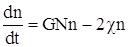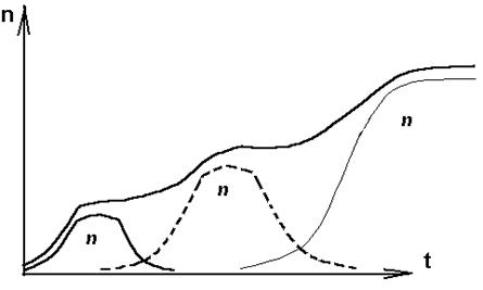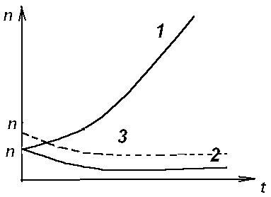 3.3. ДИНАМИКА ПОПУЛЯЦИИ . О распространении и численности видов была собрана обширная информация . Макроскопической характеристикой , описывающей популяцию , может быть число особей в популяции . Это число играет роль параметра порядка . Если различные виды поддерживаются общим пищевым ресурсом , то начинается межвидовая борьба , и тогда применим принцип Дарвина : выживает наиболее приспособленный вид . ( Нельзя не отметить сильнейшую аналогию , существующую между конкуренцией лазерных мод и межвидовой борьбой ). Если имеются однотипные пищевые ресурсы , то становится возможным сосуществование видов . Численность видов может быть подвержена временным колебаниям. ОДИН ВИД. Рассмотрим сначала одну популяцию с числом особей в ней n . При наличии пищевых ресурсов А особи размножаются со скоростью :