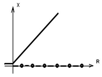 Рис. 2.3. Бифуркационная диограмма для уравнения ( 2.5.) . Сплошная линия соответствует устойчивой ветви , точки - неустойчивой ветви . Анализ устойчивости в линейном приближении позволяет проверить , что решение X = 0 при переходе через R = 0 становится неустойчивым , а решение X = R - устойчивым . В общем случаи при возрастании некоторого характеристического параметра р происходят последовательные бифуркации . На рисунке 2.4. показано единственное решение при р = р1 , но при р = р2 единственность уступает место множественным решения . Интересно отметить , что бифуркация в некотором смысле вводит в физику и в химию , историю - элемент , который прежде считался прерогативой наук занимающихся изучением биологическим , общественных и культурных явлений .