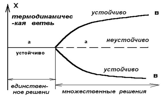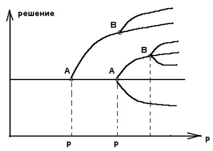 Рис. 2.4. Последовательные бифуркации : А и А1 - точки первичных бифуркаций из термодинамической ветви , В и В1 - точки вторичной бифуркации . Известно , что при изменении управляющих параметров в системе наблюдаются разнообразные переходные явления . Выделим теперь из этих наблюдений определенные общие черты , характерные для большого числа других переходов в физико химических системах . С этой целью представим графически (рис. 2.5) зависимость вертикальной компоненты скорости течения жидкости в некоторой определенной точке от внешнего ограничения , или , в более общем виде , зависимость переменной состояние системы Х (или х = Х - Хs ) от управляющего параметра l . Таким образом мы получим график , известный под названием бифуркационной диаграммы .