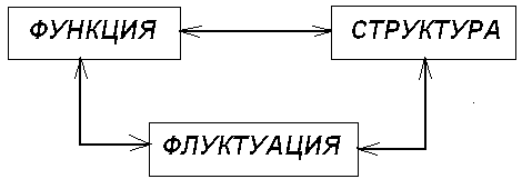 Рис. 1. Три аспекта диссипативных структур. Взаимодействия между этими аспектами приводит к неожиданным явлениям - к возникновению порядка через флуктуации , формированию высокоорганизованной структуры из хаоса. Таким образом , в диссипативных структурах происходит становление из бытия , формируется возникающее из существующего. 2.2. САМООРГАНИЗАЦИЯ РАЗЛИЧНЫХ СТСТЕМ И СЕНЕРГЕТИКА. Переход от хаоса к порядку , происходящий при изменении значений параметров от до критических к сверхкритическим , изменяет симметрию системы . По этому такой переход аналогичен термодинамическим фазовым переходам . Переходы в неравновесных процессах называются кинетическими фазовыми переходами . В близи неравновесных фазовых переходов не существует непротиворечивого макроскопического описания . Флуктуации столь же важны , как и среднее значении . Например , макроскопические флуктуации могут приводить к новым типам не устойчивостей . Итак , в дали от равновесия между химической , кинетической и пространственно-временной структурой реагирующих систем существует неожиданная связь . Правда , взаимодействие , определяющие взаимодействие констант скоростей и коэффициентов переноса , обусловлены короткодействующими силами ( силами валентности , водородными связями и силами Ван-Дер-Вальса) . Однако решения соответствующих уравнений зависят , кроме того , от глобальных характеристик . Для возникновения диссипативных структур обычно требуется , чтобы размеры системы превышали некоторое критическое значение - сложную функцию параметров , описывающих реакционно-диффузионные процессы . Мы можем по этому утверждать , что химические неустойчивости задают дальнейший порядок , посредством которого система действует как целое . Если учесть диффузию , то