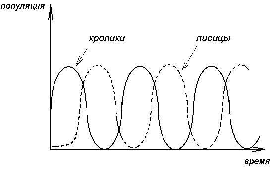 Рис. 3.6. Последовательное заполнение экологической ниши различными видами . Эта модель позволяет придать точным количественный смысл утверждению о том , что «выживает наиболее приспособленный» , в рамках задачи о заполнении заданной экологической ниши . 3.3.2. СИСТЕМА «ЖЕРТВА - ХИЩНИК». Рассмотрим систему, состоящую из двух видов - это «жертва» и «хищник» (например , зайцы и лисицы) , то эволюция системы и ее самоорганизация выглядят иначе , чем в предыдущем случае. Пусть в биологической системе имеются две популяции - «жертв» - кролики (К) , и «хищников» - лисиц (Л), численностью К и Л . Проведем теперь рассуждение , которое позволит нам объяснить существование диссипативных структур . Кролики (К) поедают траву (Т) . Предположим , что запас травы постоянен и неисчерпаем . Тогда , одновременное наличие травы и кроликов способствуют неограниченному росту кроличьей популяции . Этот процесс можно символически изобразить так : Кролики + Трава ® Больше кроликов К + Т ® 2К Тот факт , что в стране кроликов всегда имеется в достатке травы , вполне аналогичен непрерывному подводу тепловой энергии в задаче с ячейками Бенара . Вскоре процесс , в целом , будет выглядеть как диссипативный (во многом аналогично процессу Бенара ). Реакция « Кролики - Трава » происходит спонтанно в направлении увеличения популяции кроликов, что является прямым следствием второго начала термодинамики . Но вот в нашу картину , где мирно резвятся кролики , прокрались хищные лисицы (Л), для которых кролики являются добычей . Подобно тому , как по мере поедания травы кроликов становится больше , за счет поедания кроликов возрастает число лисиц : Лисицы + Кролики ® Больше лисиц Л + К ® 2Л В свою очередь лисицы , как и кролики являются жертвами - на этот раз человека , точнее говоря происходит процесс Лисицы ® Меха Конечный продукт - Меха , не играет непосредственной роли в дальнейшем ходе процесса . Этот конечный продукт можно , однако , рассматривать как носитель энергии, выводимой из системы , к которой она была в начале подведена (например, в виде травы ). Таким образом , в экологической системе также существует поток энергии - аналогично тому , как это имеет место в химической пробирке или биологической клетке . Совершенно ясно , что в действительности происходят периодические колебания численности популяции кроликов и лисиц , причем за нарастании численности кроликов следует нарастание численности лисиц , которые сменяются уменьшением численности кроликов , сопровождающимся столь же резким снижением численности лисиц , затем повышенным подъемом численности кроликов и так далее (рис. 3.7).