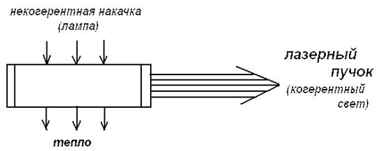 Рис. 2.8. Поток тепла в тонком слое жидкости. Увеличение разности температур DТ , то есть дальнейшее отклонение системы от равновесия , приводит к тому , что состояние неподвижной теплопроводящей жидкости становится неустойчивым участок б на рисунке 2.8. Это состояние сменяется устойчивым состоянием (участок в на рис. 2.8) , характеризующимся образованием ячеек . При больших разностях температур покоящаяся жидкость не обеспечивает большой перенос тепла , жидкость ²вынуждена² двигаться , причем кооперативным коллективным согласованном образом. Далее этот вопрос рассматривается в 3 главе. 2.3.1в. ЛАЗЕР , КАК САМООРГАНИЗУЮЩАЯСЯ СИСТЕМА. Итак , в качестве примера физической системы , упорядоченность которой есть следствие внешнего воздействия , рассмотрим лазер. При самом грубом описании лазер - это некая стеклянная трубка , в которую поступает свет от некогерентного источника (обычной лампы) , а выходит из нее узконаправленный когерентный световой пучок , при этом выделяется некоторое количества тепла.