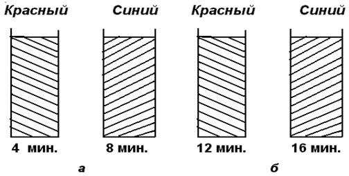 Рис. 2.9. Излучение лазера в до критической (а) и сверхкритической (б) области. Видно , что образование структуры в жидкости и в лазере формально описывается весьма сходным образом . Аналогия связана с наличием тех же самых типов бифуркаций в соответствующих динамических уровнях. Подробнее этот вопрос рассмотрим в практической части , в 3 главе. 2.3.2. ХИМИЧЕСКИЕ СИСТЕМЫ . В этой области синергетика сосредотачивает свое внимание на тех явлениях , которые сопровождаются образованием макроскопических структур . Обычно если дать реагентам про взаимодействовать, интенсивно перемешивая реакционную смесь, то конечный продукт получается однородный . Но в некоторых реакциях могут возникать временные, пространственные или смешанные ( пространственные - временные) структуры . Наиболее известным примером может служить реакция Белоусова - Жаботинского . 2.3.2а. РЕАКЦИЯ БЕЛАУСОВА - ЖАБОТИНСКОГО. Рассмотрим реакцию Белоусова -Жаботинского . В колбу сливают в определенных пропорциях Ce2(SO4) , KBrO3 , CH2(COOH)2, H2SO4 , добавляют несколько капель индикатора окисления - восстановления - ферроина и перемешивают . Более конкретно - исследуются окислительно - восстановительные реакции Ce 3+_ _ _ Ce 4+ ; Ce 4+_ _ _ Ce 3+ в растворе сульфата церия , бромида калия , малоковой кислоты и серной кислоты . Добавление феррогена позволяет следить за ходом реакции по изменению цвета ( по спектральному поглащению ) . При высокой концентрации реагирующих веществ , превышающих критическое значение сродства , наблюдаются необычные явления . При составе сульфат церия - 0,12 ммоль/л бромида калия - 0,60 ммоль/л малоковой кислоты - 48 ммоль/л 3-нормальная серная кислота , немного ферроина При 60 С изменение концентрации ионов церия приобретает характер релаксационных колебании - цвет раствора со временем периодически изменяется от красного (при избытке Се3+ ) до синего ( при избытке Се 4+) , рисунок 2.10а .