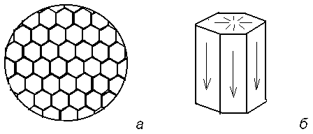 Рис. 2.7. Ячейки Бенара : а) - общий вид структуры б) - отдельная ячейка. Эта структура образовалась в ртути , налитой в плоский широкий сосуд , подогреваемый снизу , после того как температурный градиент превысил некоторое критическое значение . Весь слой ртути (или другой вязкой жидкости) распадался на одинаковые вертикальные шестигранные призмы с определенным соотношением между стороной и высотой (ячейки Бенара). В центральной области призмы жидкость поднимается , а вблизи вертикальных граней - опускается . Возникает разность температур Т между нижней и верхней поверхностью DТ = Т2 - Т1 > 0 .Для малых до критических разностей DТ < DТkp жидкость остается в покое , тепло снизу вверх передается путем теплопроводности . При достижении температуры подогрева критического значения Т2 = Тkp (соответственно DТ = DТkp ) начинается конвекция . При достижении критического значения параметра Т , рождается , таким образом , пространственная диссипативная структура . При равновесии температуры равны Т2 =Т1 , DТ = 0 . При кратковременном подогреве (подводе тепла) нижней плоскости , то есть при кратковременном внешнем возмущении температура быстро станет однородной и равной ее первоначальному значению . Возмущение затухает , а состояние - асимптотически устойчиво. При длительном , но до критическом подогреве ( DТ < DТkp ) в системе снова установится простое и единственное состояние , в котором происходит перенос к верхней поверхности и передачи его во внешнюю среду (теплопроводность) , рис. 2.8 , участок а . Отличие этого состояния от равновесного состояния состоит в том , что температура , плотность , давление станут неоднородными . Они будут приблизительно линейно изменяться от теплой области к холодной .