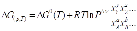 Здесь ∆G0(T) – изменение энергии Гиббса для реакции, протекающей при той же температуре, но при условии , что все реагенты находятся при стандартном давлении PB=PC=…=PY=PZ=…=1. Если учесть, что парциальные давления Pi могут быть выражены на основании закона Дальтона через общее давление P и мольную концентрацию компонента xi, то
