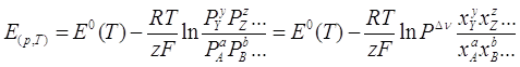 где ∆v=(y+z+…)-(b+c+…) – изменение числа молей при реакции. Для ЭДС можно записать аналогичные выражения