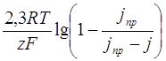 Поляризация электродов. Под поляризацией понимают изменение свойств поверхности электродов и прилегающих к ним слоев электролита, вызванное прохождением электрического тока через поверхность. Прохождение тока сопровождается появлением разности потенциалов, противоположной той, которая вызвала электрический ток. Величина ЭДС поляризации определяется разностью потенциалов электрода под током и без тока. Обычно различают три вида поляризаций: концентрационную, электрохимическую или активационную и омическую. Концентрационная поляризация обусловлена тем, что концентрация вещества около электрода при прохождении тока отличается от концентрации веществ в объеме раствора, так как подвод или отвод веществ не успевает за потреблением этих веществ на электроде. Концентрационная поляризация связана с током, протекающим на электроде, уравнением ∆εконц= - где jпр – предельная плотность тока, т.е. максимальная сила тока, которую можно получит в данных условиях на электроде, отнесенная к единице поверхности электрода: