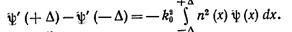 (6), (6'), (6") где А, В, α, β, a и b — произвольные постоянные. Однако это — общие решения трех независимых уравнений (5), (5'), (5") и они, вообще говоря, не образуют какой-либо одной волновой функции, описывающей состояние частицы, движущейся в силовом поле U (х). Для того чтобы они давали действительно одну функцию ψ (х), мы должны соблюсти краевые условия, которые мы сейчас установим. Для этого будем рассматривать U (х) и, следовательно, п (х) как плавную функцию х. Интегрируя тогда уравнение (5) около точки х = 0, получим
