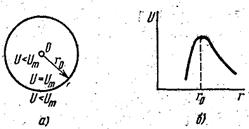 Рис.4.1. Потенциальный барьер, ограничивающий замкнутую область (r < r0) Есть та поверхность, на которой потенциальная энергия U (r) принимает максимальное значение, так что для r < r0, U < Um и для r > r0, U < Um. Соответствующий пример графика U(г) дан на рис. 1, б. Допустим, что нас интересует прохождение через барьер частиц, первоначально находившихся внутри него. Соответственно предположению, что частицы, падающие извне, отсутствуют (нет «бомбардировки»), мы должны взять вне барьера лишь уходящие волны.