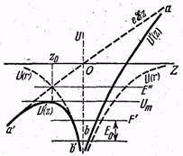Рис. 6.1. Сложение атомного и внешнего поля. Рассмотрим вид потенциальной кривой на оси OZ(x = y = 0, r = | z |). В отсутствие внешнего поля (ξ = 0) U' = U (r) и имеет вид, изображенный на рис. 6.1 пунктиром. Дополнительная потенциальная энергия во внешнем поле еξz изобразится пунктирной прямой аа'. Кривая полной потенциальной энергии U, получающаяся сложением, проведена на рис. 6.1 сплошной линией а'b' и ab. Мы видим, что около точки z0 образуется потенциальный барьер, разделяющий пространство на две области: внутреннюю z > z0 и внешнюю z < z0, в каждой из которых потенциальная энергия U' меньше U' (z0) = Um. На рис. 6.1 приведены также два уровня энергии Е` и Е". Если энергия Е = Е" > Um, то электрон не будет удерживаться вблизи атома, а будет удаляться в область отрицательных z. Если же энергия электрона Е = Е' < Um, то, согласно законам классической механики, электрон останется во внутренней области. По квантовой механике в этом случае просачивание через барьер все же будет иметь, место. Таким образом, здесь создается положение вещей, вполне аналогичное тому, которое имеет место при радиоактивном распаде. Теперь уже совсем нетрудно понять причину ионизации атомов полем. При включении поля получается барьер, через который электроны проникают во внешнее пространство. Если высота барьера Uт меньше энергии электрона, то частицы будут проходить («над барьером») и по классической механике. Поэтому и классическая механика приводит к возможности ионизации атома внешним электрическим полем. Различие заключается лишь в том, что по законам квантовой механики эта ионизация должна наступать при меньших полях, нежели это предписывается механикой классической, так как, согласно квантовой механике, для возможности ионизации не нужно, чтобы барьер оказался ниже энергии электрона. Ясно, однако, что при малых полях барьер будет очень широким и прозрачность его будет очень мала. Явление автоионизации можно наблюдать таким образом: допустим, что мы наблюдаем какую-либо спектральную линию, обусловленную электронным переходом из состояния Е` в Ео (см. рис. 6. 1). По мере увеличения электрического поля эта линия будет смещаться (Штарк - эффект), и если поле достигнет столь большой величины, что прозрачность барьера будет велика, то электрон в состоянии Е` будет чаще вылетать из атома, проходя через барьер (ионизация), нежели падать в нижнее состояние (Ео), излучая свет. Благодаря этому спектральная линия будет слабеть, пока, наконец, совсем не исчезнет. Это явление можно наблюдать на бальмеровской серии атомного водорода. Для того чтобы иметь возможность проследить действие электрического поля различной напряженности, устраивают так, что различные части спектральной линии обусловливаются светом, исходящим от атомов, находящихся в полях различной силы. Именно, в объеме светящегося газа электрическое поле возрастает в направлении, параллельном щели спектроскопа (до некоторого предела, достигнув которого оно вновь