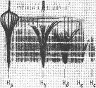 Рис 6.2 Расщепление спектральных линий бальмеровской серии при больших электрических полях падает). На фотографии (см. рис. 6.2) рис приведены результаты подобного опыта. Буквами β, γ, δ, ε, ζ, обозначены линии серии Бальмера ( Нβ — переход n = 4 → n = 2, Нγ — переход n = 5 → n = 2, Нδ — переход n = 6 → n = 2 и Нε — переход n = 7 → n = 2 ). Приложенное электрическое поле растет снизу вверх. Белые линии на фотографии суть линии одинаковой напряженности поля. Из фотографии видно, что линии сначала расщепляются. Это расщепление увеличивается по мере роста поля (из расщепления линии Нβ легко видеть положение линии максимальной напряженности поля). При некоторой напряженности поля спектральная линия исчезает. Сравнение линий β, γ, δ, ε, показывает, что они исчезают в последовательности ε, δ, γ (при достигнутых полях β полностью не исчезает). Это есть последовательность возрастания энергии возбужденного состояния. Из рис, 6.1 явствует, что чем выше энергия электрона, тем меньше при заданном поле ширина и высота барьера, т. е. тем больше его прозрачность. Таким образом, наблюдающаяся последовательность в исчезновении спектральных линий вполне соответствует нашему толкованию этого явления как результата туннельного эффекта. То обстоятельство, что красные компоненты расщепленных линий исчезают раньше фиолетовых, также получает полное разъяснение при более детальном рассмотрении волновых функций электрона. Именно, состояния, отвечающие линиям, смещенным в красную сторону, обладают тем свойством, что в них интенсивность электронного облака больше в области барьера, нежели в состояниях для фиолетовых компонент. Благодаря этому ионизация протекает более благоприятным образом. Сформулируем несколько