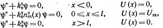 в которой U(x2)=E (рис.1). Таким образом, потенциальный барьер является «непрозрачной» перегородкой для всех частиц, энергия которых меньше Um (напротив, он «прозрачен» для частиц, обладающих энергией Е >Um). Этим и разъясняется название «потенциальный барьер». Совсем иначе протекают явления вблизи потенциальных барьеров, если речь идет о движениях микроскопических частиц в микроскопических полях, т. е. о движениях, при рассмотрении которых нельзя игнорировать квантовые эффекты. В этом случае, как мы сейчас увидим, в противоположность выводам классической механики, частицы с энергией Е, большей высоты барьера Um, частично отражаются от барьера, а частицы с энергией, меньшей Um, частично проникают через барьер. Для того чтобы в этом убедиться, мы рассмотрим совсем простой случай барьера, изображенный на рис. 2. Именно, мы будем считать, что потенциальная энергия частицы U (х) всюду равна нулю, кроме области 0 ≤ Х ≤ l, где она имеет постоянное значение, равное Um. Такой барьер представляет собой, конечно, идеализацию, но на нем, особенно просто можно проследить интересующие нас стороны проблемы. Мы можем себе представить, что такой прямоугольный барьер возникает путем непрерывной деформации плавного барьера, изображенного на рис. 1. Будем искать стационарные состояния частицы, движущейся в поле такого барьера. Обозначая потенциальную энергию через U (х), мы получим уравнение Щредингера в виде