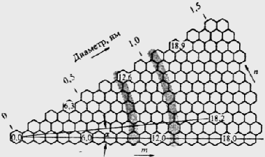 Одним из основных параметров, характеризующих нанотрубки является хиральность. Трубки характеризуются различной хиральностью, т.е. углом ориентации графитовой плоскости относительно оси трубки. Идеализированная нанотрубка представляет собой свернутую в цилиндр графитовую плоскость, т.е. поверхность выложенную правильными шестиугольниками, в вершинах которых расположены атомы углерода. Результат такой операции зависит от угла ориентации графитовой плоскости относительно оси нанотрубки. Угол ориентации задает хиральность нанотрубки, которая определяет, в частности ее электрические характеристики. Это свойство нанотрубок иллюстрируется на рис. 6, где показана часть графитовой плоскости и отмечены возможные направления ее сворачивания. Хиральность нанотрубок обозначается набором символов (m,n), указывающим координаты шестиугольника, который в результате сворачивания плоскости должен совпасть с шестиугольником, находящимся в начале координат. Некоторые из таких шестиугольников вместе с соответствующими обозначениями отмечены на рисунке. Другой способ обозначения хираль-ности состоит в указании угла а между направлением свора-чивания нанотрубки и направлением, в котором соседние шестиугольники имеют общую сторону. Среди различных возможных направлений сворачи-вания нанотрубок выделяются направле-ния, для которых совмещение шести-угольника (m,n) с началом координат не требует искажения в его структуре. Этим направлениям соответствуют угол а=О и а=30°. Указанные конфигурации отвечают хиральностям (m,0) и (2n,n) соответственно. Индексы хиральности однослоиной нанотрубки (m,n) однозначным образом определяют ее диаметр D. Эта связь очевидна и имеет следующий вид: