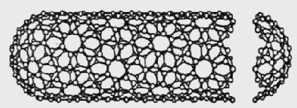 Рис. 7. Идеальная модель однослойной нанотрубки. Рассмотрим упрощенную модель нанотрубки. На рисунке 7 представлена идеализированная модель однослойной нанотрубки. Такая трубка не образует швов при сворачивают и заканчивается по-лусферическими вершинами, содер-жащими, наряду с правильными шес-тиугольниками, также по шесть правильных пятиугольников. Нали-чие пятиугольни-ков на концах трубок позволяет рассматривать их как предельный случай молекул фуллеренов, длина продольной оси которых значительно превышает диаметр. Структура однослойных нанотрубок, наблюдаемых экспериментально, во многих отношениях отличается от представленной выше идеализированной картины. Прежде всего это касается вершин нанотрубки, форма которых, как следует из наблюдений, далека от идеальной полусферы. Особое место среди однослойных нанотрубок занимают нанотрубки с хиральнстью (10,10). В нанотрубках такого типа две из С-С-связей, входящих в состав каждого шестичленного кольца, ориентированы параллельно продольной оси трубки. Согласно расчетам нанотрубки с подобной структурой должны обладать чисто металлической проводимостью. Кроме того, термодинамические расчеты показывают, что такие трубки обладают повышенной стабильностью и должны преобладать над трубками другой хиральности в условиях, когда преимущественно образуются однослойные нанотрубки. До недавнего времени такие идеализированные условия казались недостижимыми. Однако в результате облучения поверхности графита импульсами двух лазеров в присутствие никелевого катализатора был осуществлен синтез нанотрубок диаметром 1.36 нм и длиной до нескольких сот микрон, обладающих металлической проводимостью, выводы теории нашли экспериментальное подтверждение. Как следует из измерений, выполненных с помощью электронного микроскопа и рентгеновского дифрактометра, нанотрубки с преимущественной хиральностью (10,10) образуют жгуты диаметром от 5 до 20 мкм, свернутые в клубки и запутанные причудливым образом. Кроме того, измерения спектров ЭПР, подкрепленные прямыми измерениями проводимости нанотрубок, указывают на металлический характер электропроводности этих материалов. При прямом измерении хиральности нанотрубок использовали электронно-дифракционный микроскоп с чрезвычайно малым поперечным сечением электронного пучка (около 0,7 нм), быстро сканируемого по области диаметром 10 - 20 нм, заполненной жгутом нанотрубок. На основании получаемой таким образом дифракционной картины делаются выводы о структуре нанотрубок, входящих в состав канатов. Было изучено 35 жгутов диаметром от 3 до 30 нм. Все жгуты, кроме двух, состояли из нанотрубок с хиральностью, близкой к (10,10). Детальный анализ показал, что 44% нанотрубок имели хиральность (10,10), 30% — (11,9) и 20% — (12,8). Капиллярные эффекты и заполнение нанотрубок. Вскоре после открытия углеродных нанотрубок внимание исследователей привлекла возможность заполнения нанотрубок различными веществами, что не только представляет научный интерес, но также имеет большое значение для прикладных задач, поскольку нанотрубку, заполненную проводящим, полупроводящим или сверхпроводящим материалом, можно рассматривать как наиболее миниатюрный из всех известных к настоящему времени элементов микроэлектроники. Научный интерес к данной проблеме связан с возможно