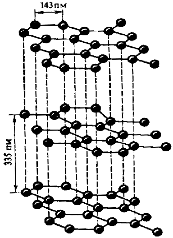 Рис. 1. Структура кристаллической решетки алмаза. Алмаз. Структура кристаллической решетки показана на рис. 1. Элементарная ячейка кристалла алмаза представляет собой тетраэдр, в центре и четырех вершинах которого расположены атомы углерода. Атомы, расположенные в вершинах тетраэдра, образуют центр нового тетраэдра и, таким образом, также окружены каждый еще четырьмя атомами и т.д. Координационное число углерода в решетке алмаза, следовательно, равно четырем. Все атомы углерода в кристаллической решетке расположены на одинаковом расстоянии (154 пм) друг от друга. Каждый из них связан с другими неполярной ковалентной связью и образует в кристалле, каких бы размеров он ни был, одну гигантскую молекулу. Графит. Структура кристаллической решетки графита показана на рис. 2. Кристаллы графита построены из параллельных друг другу плоскостей, в которых расположены атомы углерода по углам правильных шестиугольников. Расстояние между соседними атомами углерода (сторона каждого шестиугольника) 143 пм, между соседними плоскостями 335 пм. Каждая промежуточная плоскость несколько смещена по отношению к соседним плоскостям, как это видно на рисунке. Каждый атом углерода связан с тремя соседними в плоскостях атомами неполярными ковалентными связями. Каждый атом углерода в атомной решетке графита связан с тремя соседними атомами углерода, тремя sp2—sp2 общими электронными парами, расположенными в соответствии с sp2 - гибридизацией, под углами в 120 град, т. е. каждые четыре связанных между собой атома углерода в графите расположены в центре и вершинах равностороннего треугольника. Четвертые валентные электроны каждого атома располагаются между плоскостями и ведут себя подобно электронам металла, чем и объясняется электрическая проводимость графита в направлении плоскостей. Связь между атомами углерода, расположенными в соседних плоскостях, очень слабая (межмолекулярная, или ван-дер-ваальсова), хотя отчасти, благодаря присутствию электронов проводимости, похожа на металлическую. В связи с такими особенностями кристаллы графита легко расслаиваются на отдельные чешуйки даже при малых нагрузках.