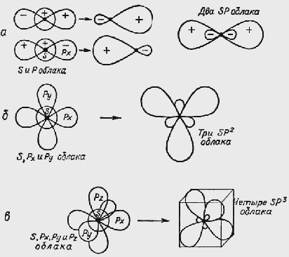 Теплопроводность графита, измеренная в направлении плоскости слоев, в пять раз больше теплопроводности, изме-ренной в поперечном направлении; электричес-кая проводимость в плоскостном направлении в десять тысяч раз превышает проводимость в поперечном направ-лении. Электронная конфи-гурация атома углерода такова: 1s2 2s2 2p2. Следовательно, его четыре внешних электрона не одинаковы — они соответствуют различным орбиталям; два электрона не спарены. В связанном состоянии (валентном) один из электронов 2s переходит на р-орбиталь (для этого понадобится около 96 ккал/моль) так, что состояние атома может быть выражено: 1s2 2s 2p3. В результате мы получим атом с тремя 2р и одним 2s-электроном: 2s2px2py2pz. Возможны несколько видов гибридизации: sp, sp2 и sp3.