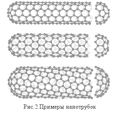 Однако разнообразие углеродных каркасных структур на этом не заканчивается. В 1991 году, опять-таки совершенно неожиданно, были обнаружены длинные, цилиндрические углеродные образования, получившие названия нанотрубок (Рис.2). Визуально, структуру таких нанотрубок можно представить себе так: берем графитовую плоскость, вырезаем из нее полоску и "склеиваем" ее в цилиндр (предостережение: такое сворачивание графитовой плоскости - это лишь способ представить себе структуру нанотрубки; реально нанотрубки растут совсем по-другому). Казалось бы, что проще - берешь графитовую плоскость и сворачиваешь в цилиндр! - однако до экспериментального открытия нанотрубок никто из теоретиков их не предсказывал! Так что ученым оставалось только изучать их - и удивляться!