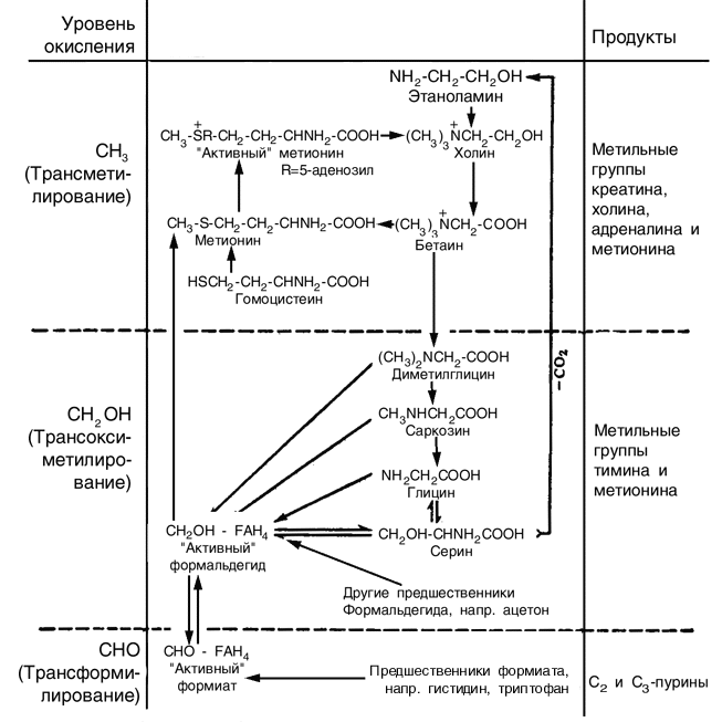 Таблица 1. Влияние витамина В12 на биосинтез метионина. Р Схема 2. Этапы переноса радикала с одним углеродным атомом. анние эксперименты с изучением роста цыплят и крыс также показали, что витамин B12 снижает потребность в метионине, особенно при введении гомоцистеина. Сначала это было истолковано как действие витамина на трансметилирование, т. е. на передачу лабильной метильной группы от холина или бетаина к гомоцистеину с образованием метионина. Точно так же витамин B12 может, по крайней мере частично, заменять холин для цыплят, крыс и поросят-сосунков. Ряд исследований (некоторые из них с использованием 14С) показал, что витамин B12 не оказывает никакого влияния на трансметилирование, но участвует в прямом синтезе лабильной метильной группы из более окисленных предшественников – таких, как формиат, α-углерод глицина или β-углерод серина. Трудности истолкования результатов, получаемых на интактных животных, хорошо иллюстрирует таблица 1.П Схема 3. Этапы превращения гомоцистина в метионин. 1 – Гомоцистин; 2 – Гомоцистеин; 3 - Метионин арактерного для авитаминозных животных (метод "парного кормления"). Подтверждение данных для поросят и цыплят в опытах с 14С-формиатом и 14С-серином получили Джонсон и сотр. Однако при использовании меченого формальдегида результат оказался неожиданным: интенсивность включения метки в метильные группы метионина и холина у цыплят с недостаточностью витамина B12 оказалась значительно повышенной. Есть основательные данные в пользу того, что новообразованные метильные группы появляются в метионине, но потом в результате трансметилирования они могут оказаться в холине или креатине. Эти выводы никто не оспаривал, но некоторые исследования позволяли предположить, что, кроме того, при недостаточности витамина B12 у крыс активность трансметилазы в печени понижена.Значение витамина B12 в переносе групп с одним атомом углерода почти неразделимо переплетается с функциями фолиевой кислоты (точнее, производных тетрагидрофолевой кислоты). Эти процессы переноса, которые могут происходить на трех различных уровнях окисления, схематически представлены на схеме 2, показаны также связанные с ними реакции окисления и восстановления. Некоторые из этих процессов переноса происходят в несколько этапов (не показанных на схеме 2) это, безусловно, относится к превращению гомоцистина в метионин, и почти нет сомнений, что для реакции в целом необходимы оба витамина. Возможная последовательность этапов показана на схеме 3. Как уже говорилось, витамину B12 приписывали участие в восстановлении гомоцистина до гомоцистеина – акцептора метильной группы. Однако последующие опыты с мечеными аминокислотами показали, что витамин, возможно, не нужен для этого восстановления. Какое-то производное фолиевой кислоты, несомненно, участвует в самом переносе радикала с одним углеродным атомом. Тогда единственная функция, остающаяся для витамина B12, состоит в восстановлении этой группы в метильную группу метионина – если только витамин не действует лишь косвенным образом, способствуя, например, синтезу ферментов. Во всяком случае, синтез метионина не может быть единственной биохимической функцией витамина В12 у высших животных, так они гибнут от его недостаточности даже при большом количестве метионина и холина в пище. Сопоставление дан