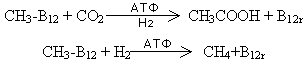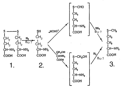 кобаламина. Схема 1. Биосинтез метионина. Мутант Е. coli, используемый для определения витамина В12, способен так же хорошо расти и при добавлении к минимальной питательной среде метионина, только для оптимального роста требуется примерно в 10000 раз больше метионина, чем витамина. Очевидный вывод, что в клетках этого организма витамин действует как катализатор синтеза метионина, был подтвержден экспериментально. Однако для любого другого микроорганизма, нуждающегося в витамине B12, этот витамин не может быть заменен метионином, так что он, очевидно, осуществляет у этих организмов какую-то дополнительную функцию.