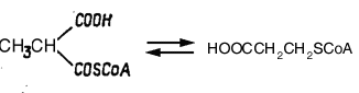 Рисунок 8. Превращение метилмалонил-СоА в сукцинил-СоА. 2-метиленглутаратмутаза С Схема 5. Схема превращения пропионил-СоА в сукцинил-СоА ледующий сходный по действию Аденозилкобаламин-зависимый фермент-это 2-метиленглутаратмутаза, катализирующая обратимое превращение между 2-метиленглутаратом и 2-метилен-З-метилсукцинатом. Фермент был выделен из микробиологических источников при выращивании Clostridium на средах, содержащих никотиновую кислоту. Определение молекулярной массы частично очищенного препарата дало величину 170000. Обработка йодацетатом приводит к потере активности, что, очевидно, свидетельствует о наличии важных для катализа SH-групп. Действие AsО2-, однако, не выявило присутствия вицинальных дитиольных групп.Ферменты, трансформирующие α, ω-диаминокислоты Еще одна группа аденозилкобаламин-зависимых ферментов была выявлена при исследовании микроорганизмов, растущих на L-лизине. Эти ферменты катализировали перенос NH2-гpyппы от концевого углеродного атома в диаминокислотах к соседнему атому углерода. Недавно описан аденозилкобаламин-зависимый фермент, который осуществляет перенос NH2-группы из α- в β-положение аминокислоты лейцина. Рассмотрим более подробно аденозилкобаламин-зависимые ферменты, трансформирующие α, ω-диаминокислоты. Эти ферменты выделены из различных штаммов Clostridium. Важно, что все три фермента в высшей степени специфичны для каждого из субстратов. Замена субстрата для данного фермента на субстраты других аминомутаз не позволяет осуществлять перенос аминогруппы. D-α-Лизинмутаза выделена из С. sticklandi, мол. масса 250000. В процессе очистки фермента не происходило отщепления аденозилкобаламина, что свидетельствует о большой прочности связи комплекса апофермент-кофермент. Аналогично от L-β-лизинмутазы в процессе очистки аденозилкобаламин также не отделялся. Это тетрамерный фермент с мол. массой 160000; его субъединичная структура была подтверждена после того, как удалось выделить компоненты с мол. массой 32000 и 52000. Оказалось, что для обеспечения нормальной каталитической активности обеих мутаз необходим белок с мол. массой 60000. Как видно, аминомутазы сохраняют способность защищать в полностью реконструированном виде важные для биокатализа SH-группы. Это свойство характерно для большинства Аденозилкобаламин-ферментов. Орнитинмутаза также представляет собой фермент с прочно связанным аденозилкобаламином, который не отщепляется при очистке. Очищенный фермент имел мол. массу 170 000 и диссоциировал на две субъединицы с мол. массой 90000. Этот фермент не требовал для своей активации какого-либо SH-белка, однако сам содержал важные для биокатализа SH-группы, вследствие чего ингибировался под действием тиоловых ингибиторов. Заслуживает особого внимания прочность, с которой связан аденозилкобаламин во всех трех ферментах. При обработке их внутренним фактором ферменты инактивировались. Сравнительное исследование трех аминомутаз показало, что в дополнение к аденозилкобаламину для проявления их активности требуются: для D-α- и L-β-мутаз ионы Mg2+ и одновалентные катионы, причем для D-α-лизинмутазы-это К+, Rb+ и NH4+ (фермент ингибируется при добавлении Na+ и Li+). L-β-лизин-мутаза в разной степени активна в присутствии Li+, Na+, К+, Rb+, Cs+ и. NH4+. Для проявления активности орнитинмутазы добавления ионов металлов вообще не требуется. По