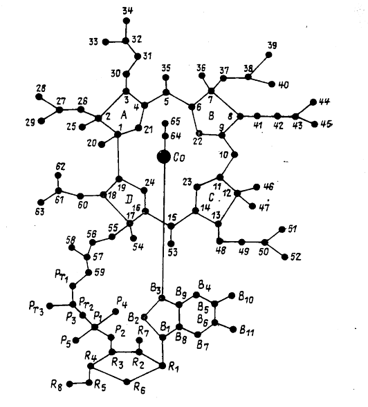 И Рисунок 7. Пространственная конфигурация молекулы витамина В12. зучение витамина B12 методом рентгеноструктурного анализа начала Дороти Ходжкин в Оксфорде в 1948 г., как только были получены первые кристаллы. Независимо подобную же работу проводил Уайт в Принстоне; позже обе группы исследователей объединили свои силы. Трудоемкие вычисления на основе результатов измерения отражении рентгеновских лучей позволили составить карты электронной плотности в трех измерениях. Постепенно, в несколько последовательных этапов, по мере того как определялось положение все большего числа атомов в структуре, расчеты уточнялись. Вся программа работы с витамином B12 и теми его аналогами, которые были получены, потребовала примерно около 10 млн. вычислений. Для этого на последних этапах пришлось использовать электронные счетные машины. Никогда еще рентгеноструктурный анализ не применялся для изучения структуры столь сложной молекулы, и полный успех этой программы изучения явился замечательным достижением, несколько смутившим химиков-органиков и, кажется, удивившим даже самих специалистов по рентгеноструктурному анализу. Как заметила Дороти Ходжкин, "возможность записать химическую структуру главным образом на основании чисто кристаллографических данных о размещении атомов в пространстве – и притом для такой устрашающе сложной молекулы - это для всякого кристаллографа нечто похожее на мечту". Огромное преимущество этого метода состояло в том, что в отличие от химических методов он "работает" от центра к периферии. Иными словами, относительно тяжелый атом кобальта с наибольшей точностью указывал положение ближайших к нему атомов, а именно атомов макрокольца. Когда работа приближалась к завершению, оказалось, что единственными атомами, положение которых оставалось несколько сомнительным, были те, для которых оно было выяснено Фолкерсом и его сотрудниками в результате изучения продуктов окисления витамина. Вычисления, относившиеся к самому витамину B12, были на время отложены, когда исследователи смогли получить кристаллическую гексакарбоновую кислоту. Это более простое соединение неожиданно легко поддавалось рентгеноструктурному анализу, в связи с чем и были достигнуты большие успехи. К счастью, основные структурные особенности этого вещества и самого витамина оказались идентичными, так что исследования этих веществ взаимно дополняли друг друга. Однако они в обоих случаях независимо привели к весьма редкой структуре макрокольца. Макрокольцо содержит 4 восстановленных пиррольных кольца с прямой α-α-связьюю между кольцами А и D. Дальнейшие уточнения в расчётах сделались возможными в результате изучения двух кобаламинов, содержащих относительно тяжелые атомы, а именно производных тиоцианата и селеноцианата; позже для этой же цели был использован аналог витамина B12, содержавший два атома хлора на месте метильных групп у бензиминазола. Наконец, выяснилась природа боковых цепей, и можно было почти с полной уверенностью написать всю структурную формулу. Все оставшиеся сомнения были, по-видимому, разрешены дальнейшими вычислениями, позволившими даже установить, что в макрокольце 6 двойных связей. УстойчивостьВ литературе накопилось много данных об устойчивости витамина B12 к действию как реактивов, так и лекарственных препара