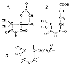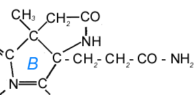 амида м Рисунок 6. Продукты окисления. алеиновой кислоты, так что вряд ли можно было относить витамин к истинным порфиринам. Но эти исследователи выделили в довольно большом количестве оксамовую кислоту. Единственные азотсодержащие продукты расщепления "ядра" молекулы выделили в 1955 г. Фолкерс и сотр. Контролируемое окисление хроматом натрия в уксусной кислоте привело к образованию двух продуктов, изображенных на рисунке 6 (1 и 2). Полагали, что они образуются из группировки, имеющей пирролидиновую, пирролиновую или пирролениновую структуру (рис. 6, 3). Это были первые химические данные, указывающие на присутствие пирролоподобной структуры в молекуле, если не считать более ранних данных по пиролизу, позволявших предполагать такую структуру. Несколько позже был выделен и соответствующий продукт, содержащий амидную группу (амид кислоты, представленной на рис. 6, 2). Это явилось прямым химическим подтверждением местоположения по крайней мере, одной из амидных групп.При окислении цианкобаламина Н2О2 в среде с рН меньше семи наблюдается выход продуктов, обладающих антагонистическим биологическим действием для lactobacillus leichmannii, в отличие от ростового для Euglena gracilis. При окислении перманганатом калия отщепляется синильная кислота, а также образуются уксусная кислота, щавелевая кислота и ее амид, бутандиовая кислота, 2-метилбутандиовая и 2,2-диметилпропандиовая кислоты. Восстановление витамина B12При каталитическом гидрировании на платиновом катализаторе цианкобаламин присоединяет пять атомов водорода и отщепляет метиламин, кобальт переходит в двухвалентное состояние с образованием т. н. В12r. При длительном восстановлении и при использовании более сильных восстановителей, таких как ацетат хрома при рН 9,5 или борогидрид натрия получают так называемый В12s, содержащий одновалентный кобальт. Восстановление внесло разочаровывающе малый вклад в наши знания о строении витамина, и даже теперь детальная структура продуктов восстановления еще достаточно не выяснена. Обработка водородом в качестве катализатора или некоторыми другими восстановительными агентами вызывает переход окраски в коричневую и, наконец, в серо-зеленую. Эти изменения, за исключением потери цианида, обратимы при контакте с кислородом воздуха, причем образуется витамин B12а. Вопрос об изменениях валентности кобальта, происходящих при восстановлении. Работа Бивена и Джонсона, появившаяся после опубликования предположительной структуры витамина, пролила некоторый свет на не решенный еще вопрос о том, содержит он 5 или 6 сопряженных двойных связей. Обратимое восстановление легко продемонстрировать, добавляя к щелочному раствору витамина B12 тиогликолевую кислоту. Красная окраска медленно переходит в оранжево-бурую; после встряхивания раствора в присутствии воздуха она тотчас же вновь становится красной. По мере использования кислорода снова медленно появляется цвет восстановленного витамина B12. Эти изменения окраски можно повторно вызывать почти до бесконечности: окончательный результат состоит в том, что витамин катализирует окисление тиогликолевой кислоты (по-видимому, до дисульфида) кислородом воздуха. Реакция с галогенамиХлор обесцвечивает раствор цианкобаламина, другие галогены – нет. Продуктом хлорирования является фиолетовое кристаллическое вещество