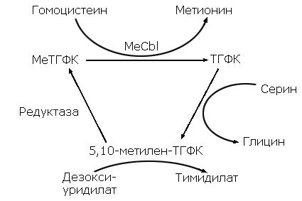 Синтез нуклеиновых кислот С самого начала работ в данной области считали почти несомненным, что витамин B12 стимулирует синтез дезоксирибонуклеиновой и, вероятно, рибонуклеиновой кислот. Молочнокислые бактерии, используемые для определения витамина B12, почти так же хорошо растут при замене его большими количествами тимидина или других дезоксирибонуклеозидов; проще всего это можно объяснить тем, что витамин B12 участвует в каком-то этапе синтеза ДНК. Выяснилось, что действие витамина связано с синтезом дезоксирибозного компонента ДНК. Некоторые ученые полагают, что у некоторых бактерий витамин B12 стимулирует синтез не только ДНК, но и РНК. Однако другие микроорганизмы, нуждающиеся в витамине B12, не способны расти на дезоксирибозидах, и нет данных о том, что у этих видов витамин контролирует синтез ДНК. У мутанта Е. coli равномерно меченный уридин превращался в тимин не только в присутствии витамина B12, но и в присутствии метионина; кроме того, у него не наблюдалось превращения меченой рибозы в дезоксирибозид. Тем не менее была тенденция переносить выводы из опытов с молочнокислыми бактериями также и на высших животных, включая человека. Этому способствовал факт энергичной регенерации эритроцитов и роста эпителия языка после лечения рецидивов пернициозной анемии цианкобаламином. Здесь действительно должен происходить быстрый синтез нуклеиновых кислот, но возможно, что этот процесс подавляется при недостаточности витамина, так как для пролиферации клеток необходимы и другие компоненты. Кроме того, активность костного мозга при пернициозной анемии отнюдь не подавлена; в самом деле, кругооборот компонентов гема примерно втрое превышает нормальный уровень, но большая часть этой активности бесполезна для образования новых эритроцитов. Ряд исследователей отмечает пониженное содержание ДНК, РНК или обеих нуклеиновых кислот в организме животных при авитаминозе В12; истолкование таких результатов усложняется тем, что авитаминозные животные потребляют меньше пищи. О`Делл и Бруммер использовали радиоактивный фосфат и нашли, что лишение как витамина B12, так и пищи вообще действительно оказывает сходное влияние на синтез нуклеиновых кислот. Глейзер и сотр. установили, что в мегалобластическом костном мозге человека отношение урацил/тимин и соответственно отношение РНК/ДНК значительно выше нормального. После лечения витамином B12 или фолиевой кислотой обе величины быстро уменьшались до нормы. Предложенное объяснение состояло в том, что витамин B12 катализирует синтез компонента ДНК – тимина; метилирование урацила с образованием тимина формально аналогично метилированию гомоцистеина с образованием метионина – реакции, которую, как известно, стимулирует витамин B12. Однако в этом исследовании, к сожалению, определяли относительные, а не абсолютные количества, между тем более ранняя работа Дэвидсона и указывает на возможность иного объяснения результатов. Эти авторы нашли, что в мегалобластическом костном мозге содержание ДНК и особенно РНК ненормально повышено в расчете как на 1 г, так и на 1 клетку; после лечения количество обеих кислот уменьшалось (правда, количество РНК - быстрее), что и должно было вести к изменению отношений, найденному Глейзером и его сотрудниками.